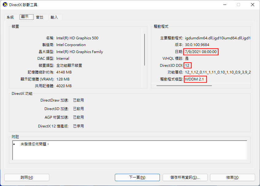 在安裝好驅動程式之後,可以透過執行 dxdiag.exe (DirectX診斷工具)來檢視顯示標籤,可發現驅動程式類型,已支援到WDDM 2.1。接著再到Microsoft Store下載 Intel Graphics Command Center (Intel顯示晶片控制中心)工具,然後點選系統下的GPU標籤,可以看到驅動程式是否為最新版本,以及所支援的DirectX、Shader,以及Vulkan等版本。
