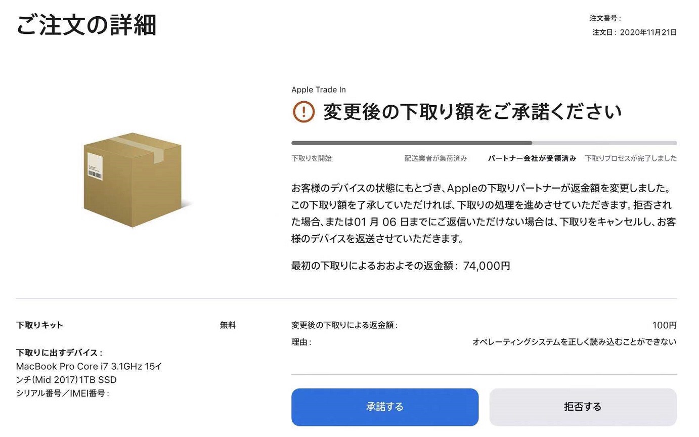 簡單說明該訊息的內容,就是:客戶送來的機器,按照規格與等級,原先預估收購價為74,000日圓(約新台幣20,100元),但此回訊為廠商收到機器之後,要變更收購價,在分隔線底下的訊息,則表示因為該電腦無法正常載入作業系統,所以想要變更價格,變成100日圓(約新台幣27元)!若客戶確定的話,就按上面承諾的藍色鈕,然後你的Mac就被對方100收,不然就是按拒否,或是等到1月6日後還沒回應的話,機器就會送回客戶手中。
