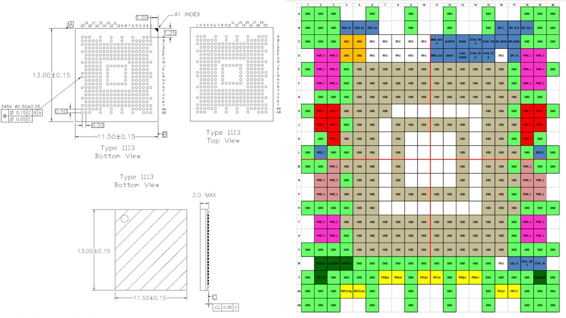 ▲ BGA 291 SSD (Type 1113)的外型規格視角圖、Ball Map腳位定義圖