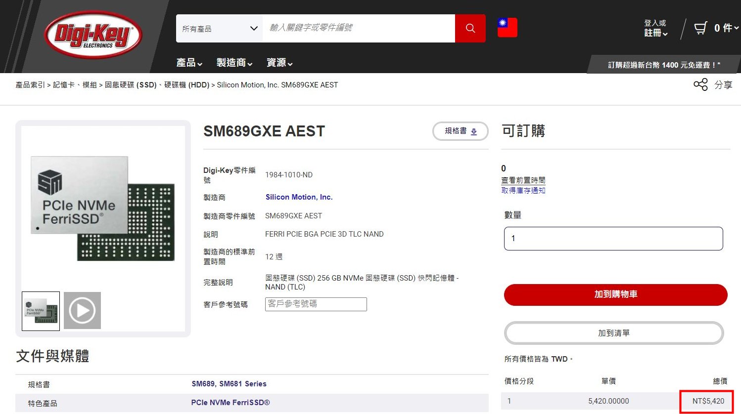 ● SMI FerriSSD 256GB 一顆參考報價就要NT$5,420._: https://www.digikey.tw/product-detail/zh/silicon-motion-inc/SM689GXE-AEST/1984-1010-ND/9678797