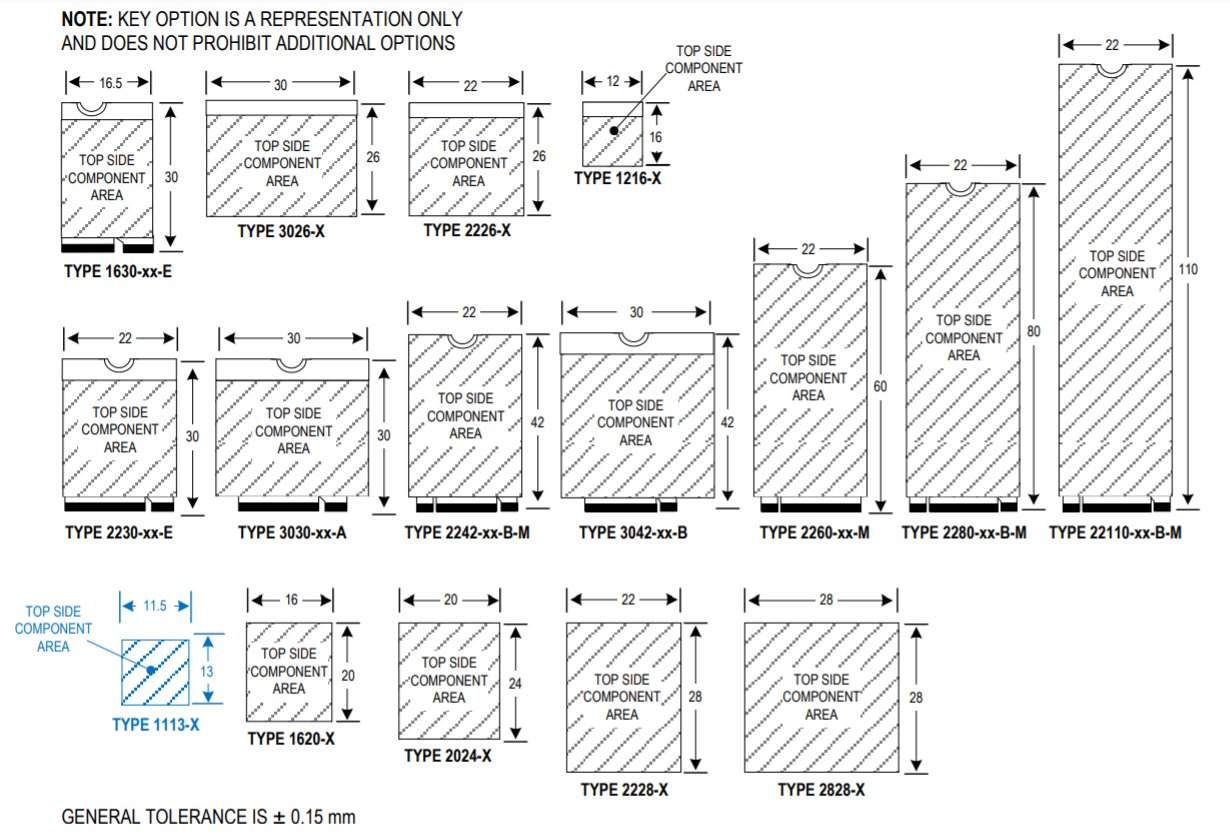 ▲ M.2 PCB版本規範(上),與M.2 BGA規範 (下),其中以藍色字Type 1113-X (11.5×13 mm)的規格為最小尺寸