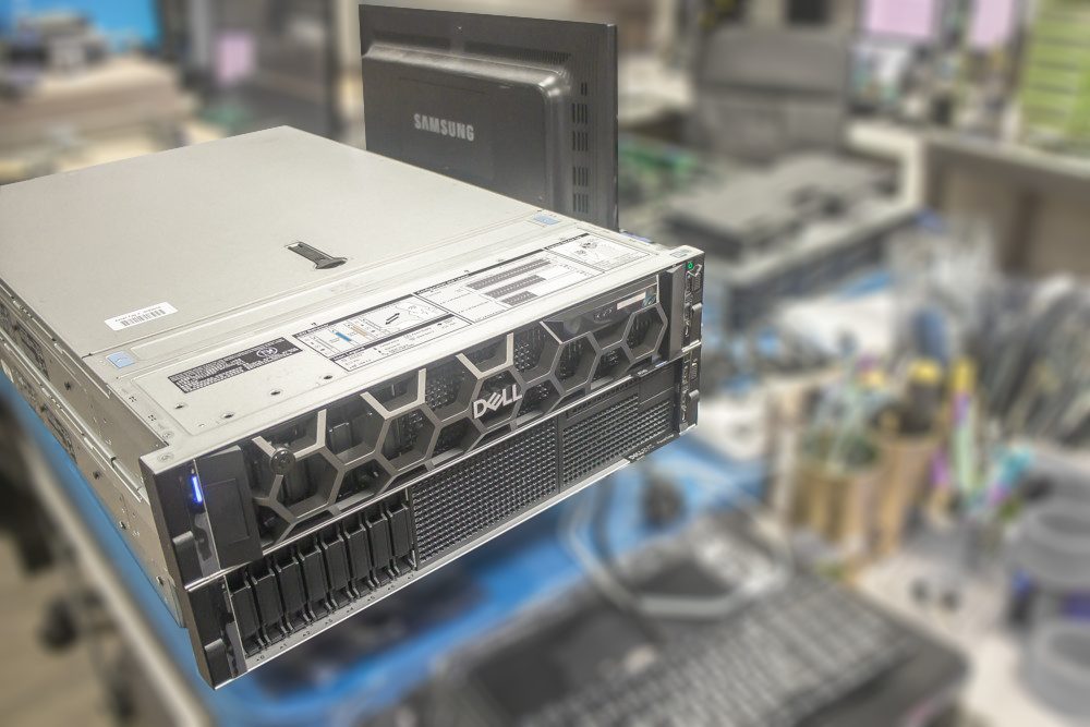 ▲ OSSLab工程部門實景一角 (背景已模糊處理),一台客戶訂的DELL R740已完成客製化組裝,正進行交機前測試。