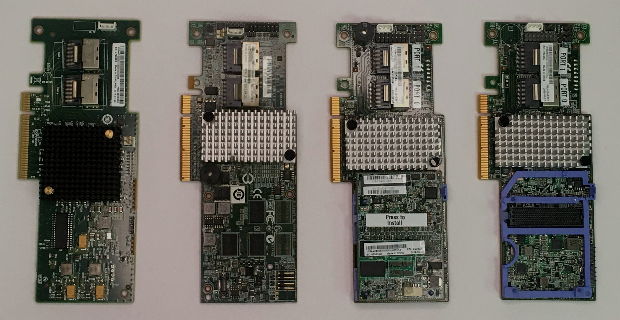 ▲本次測試的IBM ServeRAID老陣列卡家族,從左至右: M1115 (SAS 2008)、M5014 (SAS 2108)、M5110 (SAS 2208)、M5110 IT卡 (認成SAS 2308)。猜猜誰可以支援到VMware ESXi 7.0?