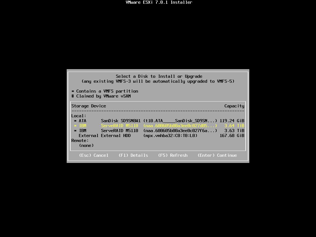 ▲ VMware ESXi 7.0 下,安裝程式可以抓到M5110陣列卡所對應的HDD,因此可以順利安裝