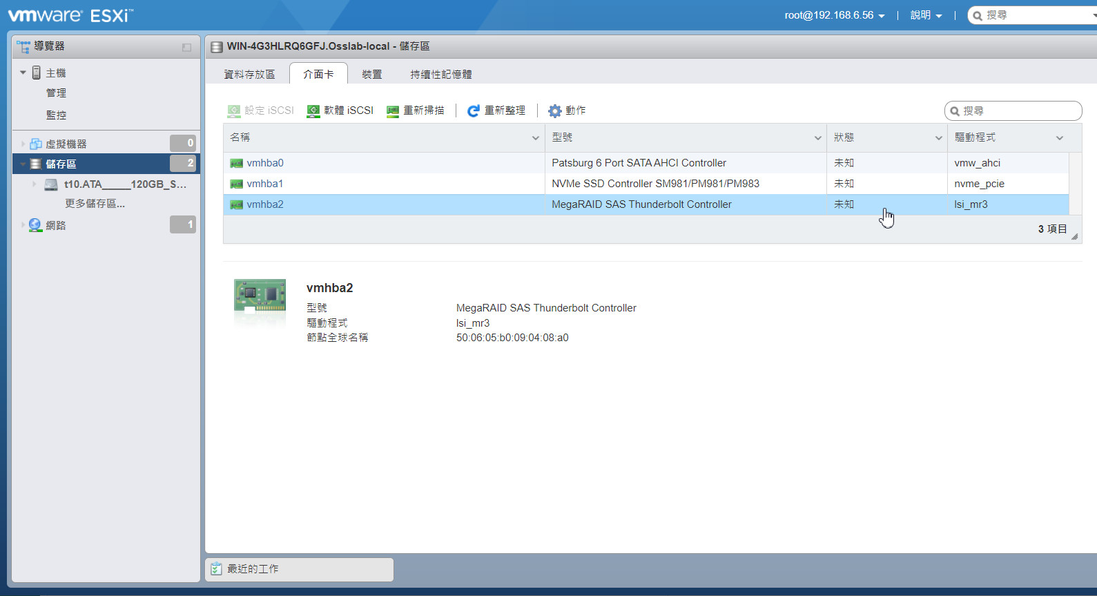 ▲ VMware ESXi 7.0 下,M5110在儲存區的介面卡欄內會被掛入,辨識成MegaRAID SAS Thunderbolt Controller,驅動程式為 lsi_mr3