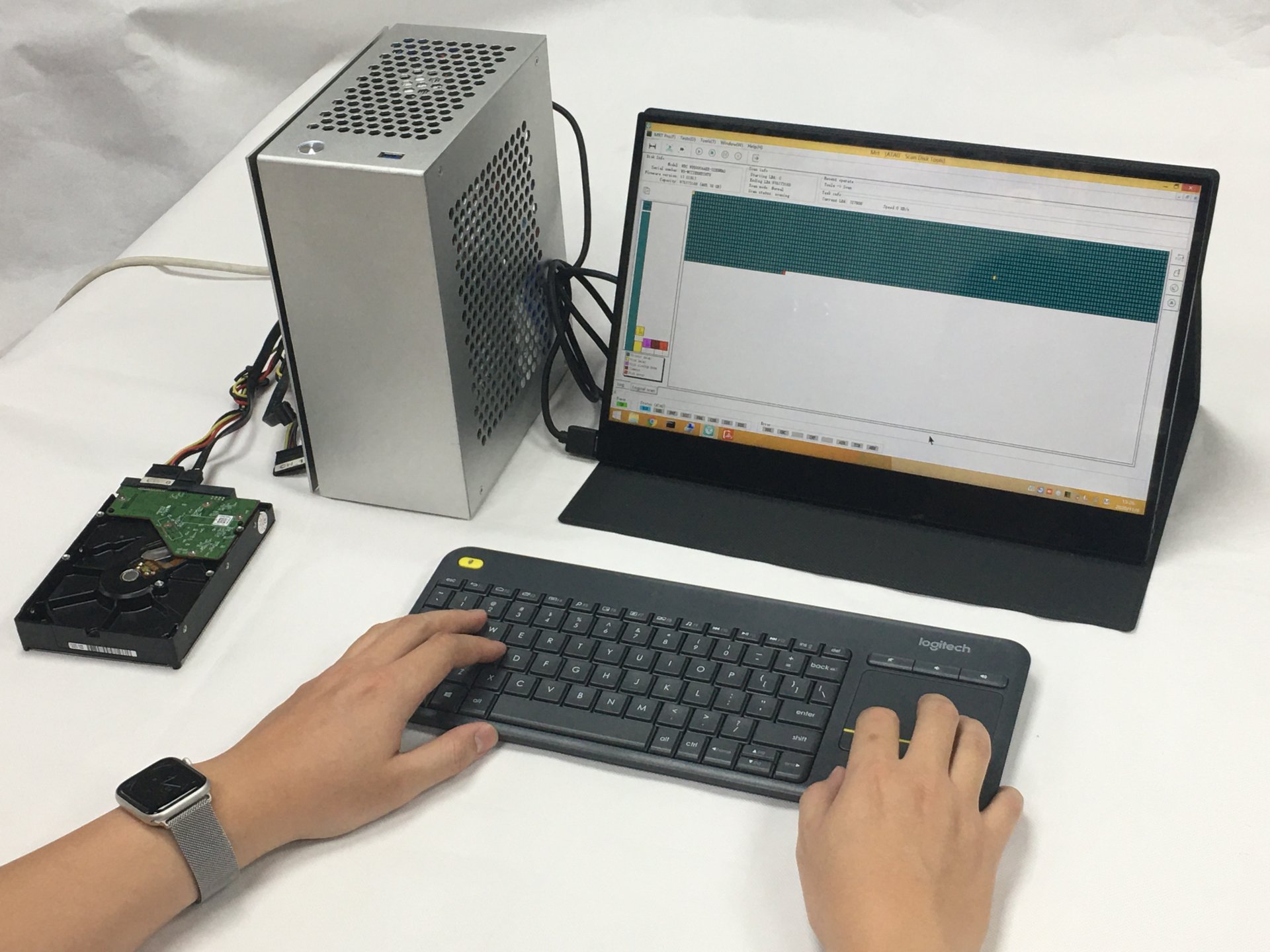 OSSLab的資料救援行動機台,是一台搭配超小的x86電腦,採用全鋁金屬機殼,體積大約只比Mac Mini大一點點而已,再搭配一台行動螢幕(Portable Monitor),以及MRT與PC-3000 Portable III等專業硬碟救援工具,因此非常輕巧好攜。工程師到客戶場所後,只需要連接好電源,並接上鍵盤滑鼠,然後將待救援的硬碟插上該機台,便可以馬上進行救援的動作。