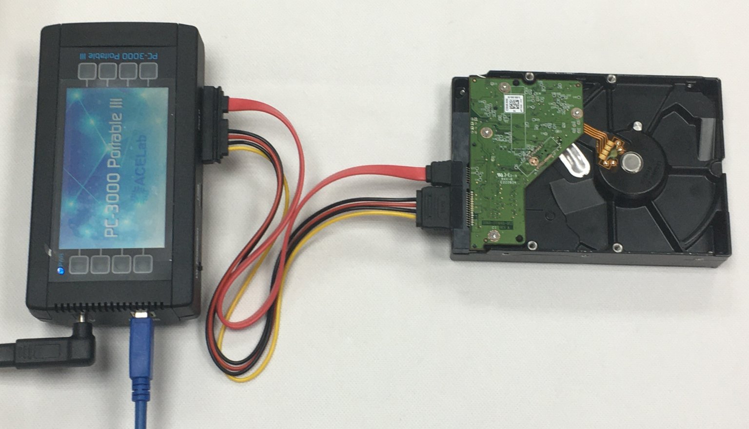 ▲ PC-3000 Portable III硬碟救援工具,與待救硬碟做連接,此為連接3.5″ HDD的例子 (支援3.5″、2.5″ HDD/SSD,以及M.2 SATA/NVMe規格SSD)