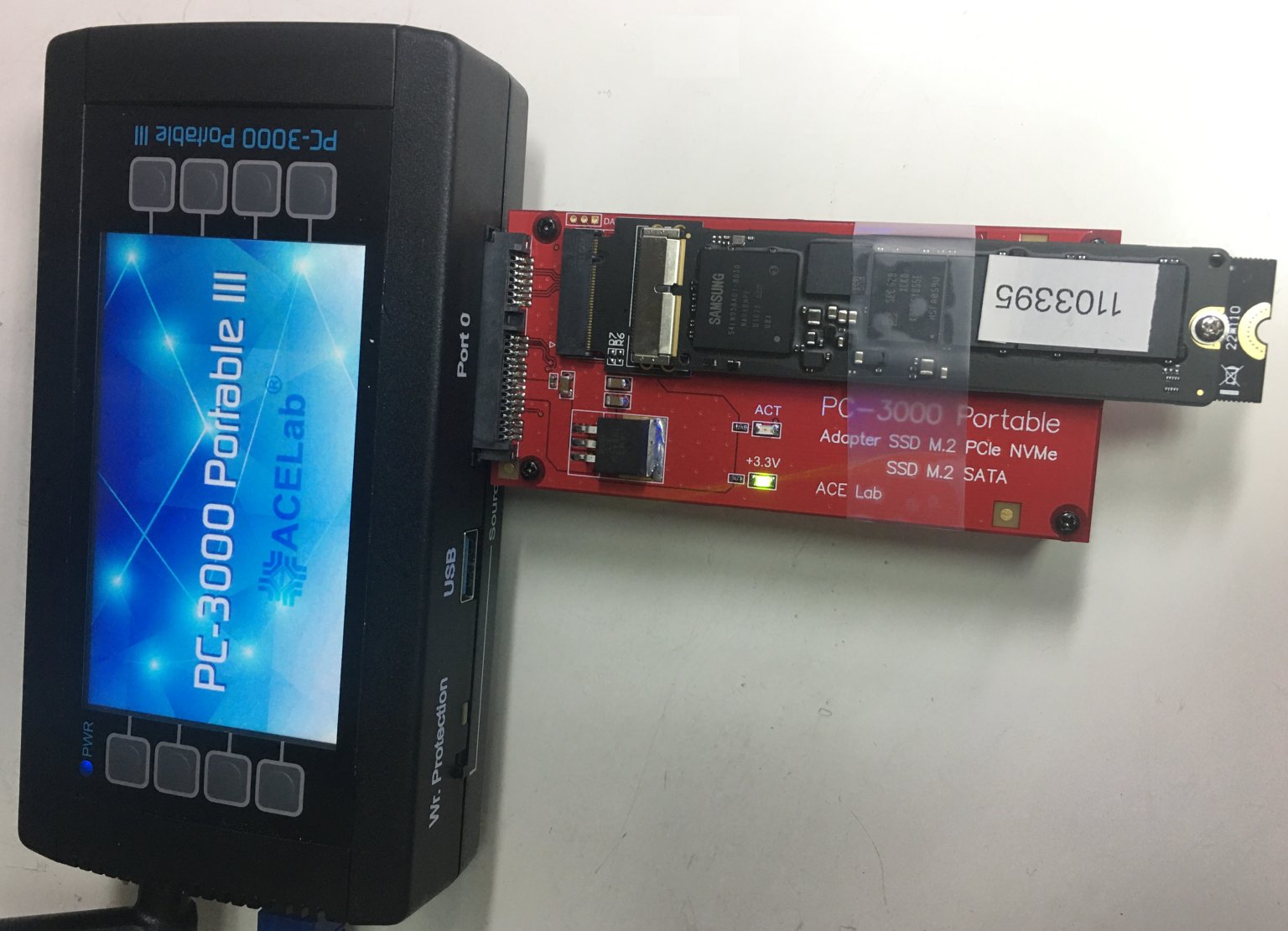 ▲ PC-3000 Portable III硬碟救援工具,與待救硬碟做連接,此為連接PCIe子卡與M.2 SSD的例子