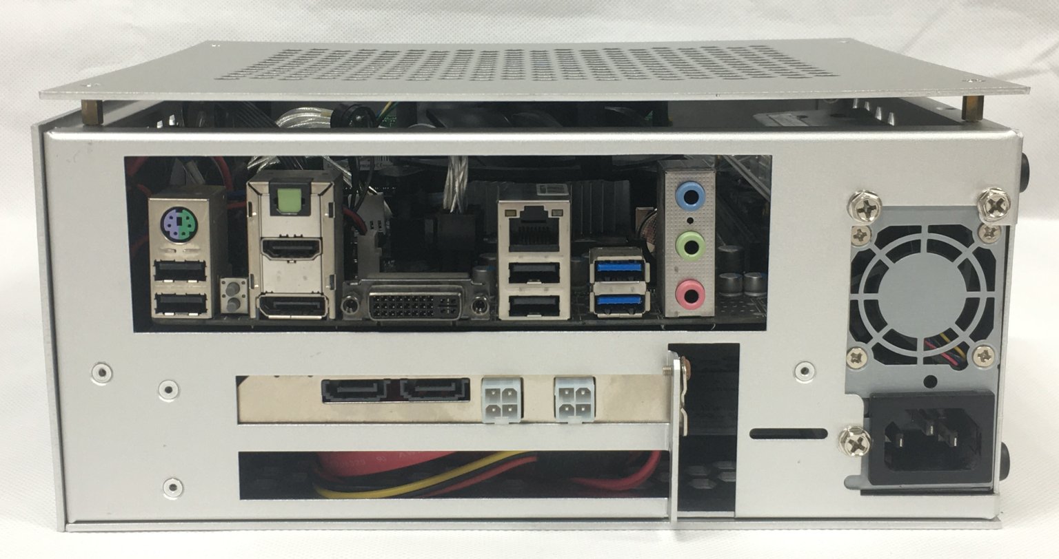 ▲ OSSLab行動機台的側面,上方因為要裝Intel原廠散熱風扇,而提高面板高度,以助於散熱需求。右圖則是背後的I/O埠,以及MRT介面卡的對外輸出埠