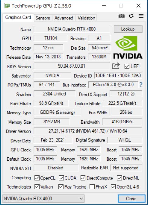 以上為 NVIDIA GeForce GTX 1070為例,像Quadro RTX 4000還有多了USB Controller和Serial Controller等裝置,以我們這次測試時的列表如下: