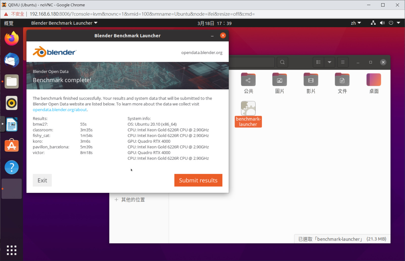 ▼以Blender Benchmark,透過CUDA介面來測試實體機與虛擬機的Quadro RTX 4000效能
