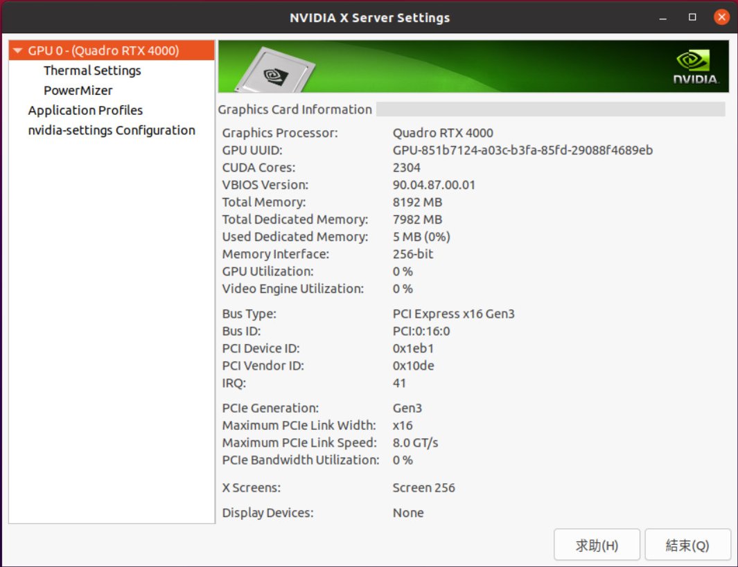 ▲以Ubuntu內建的NVIDIA X Server Settings驅動程式,來檢視Quadro RTX 4000是否能在VM環境下運作正常