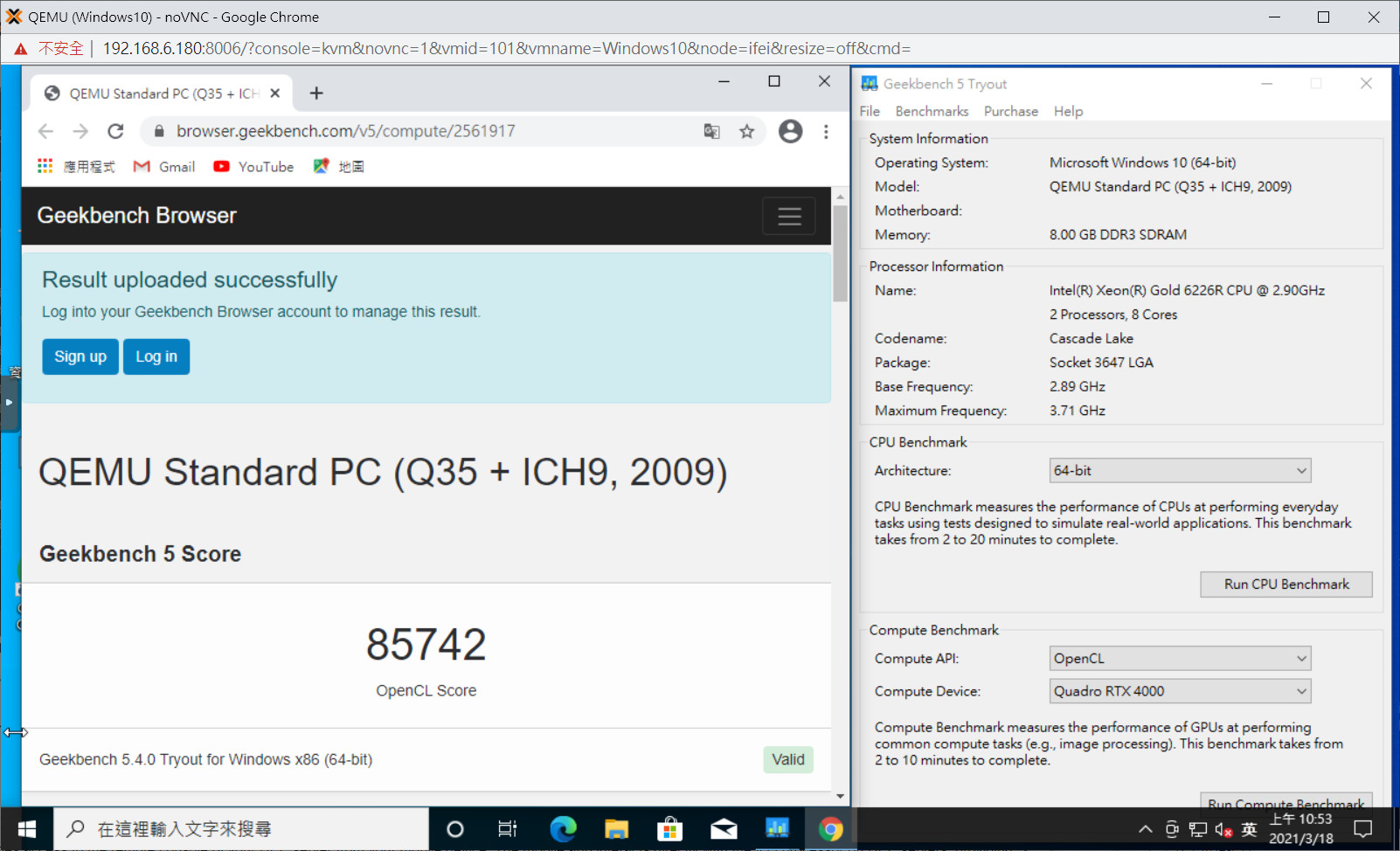 ▲Windows 10環境下,以Geekbench 5來測試VM的CUDA分數 (官方實體機測試數據為95091分)