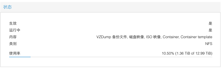 Proxmox 的標準備份可以使用GUI或者終端機下指令的方式來進行備份,首先我們先來設定NFS來進行儲存的準備,在目標伺服器上面架設NFS 伺服器之後在Proxmox新增硬碟那增加NFS之後進行掛載,就會有以下的結果出來。