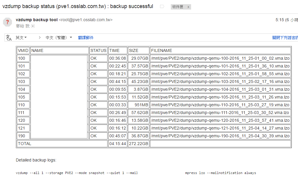 當機器在排程時間完工之後就會發送email 到你指定的信箱 就能夠看到每日的備份情況