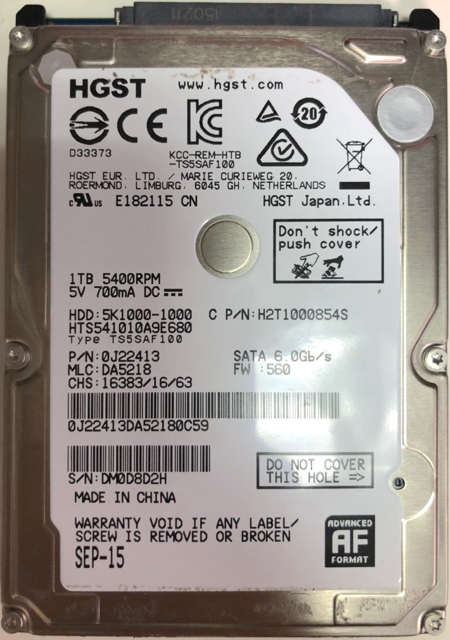 HGST HTS541010A9E680 1TB 硬碟摔到後無法讀取。 檢測應為磁頭損壞,也造成硬碟韌體與速配參數嚴重損壞,並一起造成硬碟無法正常工作,有刮盤的可能。 開盤後發現在最外圈有刮傷,在潔淨工作環境下更換磁頭,以專業硬碟救援設備回寫同版本韌體,並導出數據,再以專業救援設備手工修復速配參數與回寫同版本韌體到硬碟服務區(Service Area),完成後將數據導出並驗證,驗證發現刮傷部分應是系統部分,沒有傷到檔案層,資料可救出。 最終:成功。